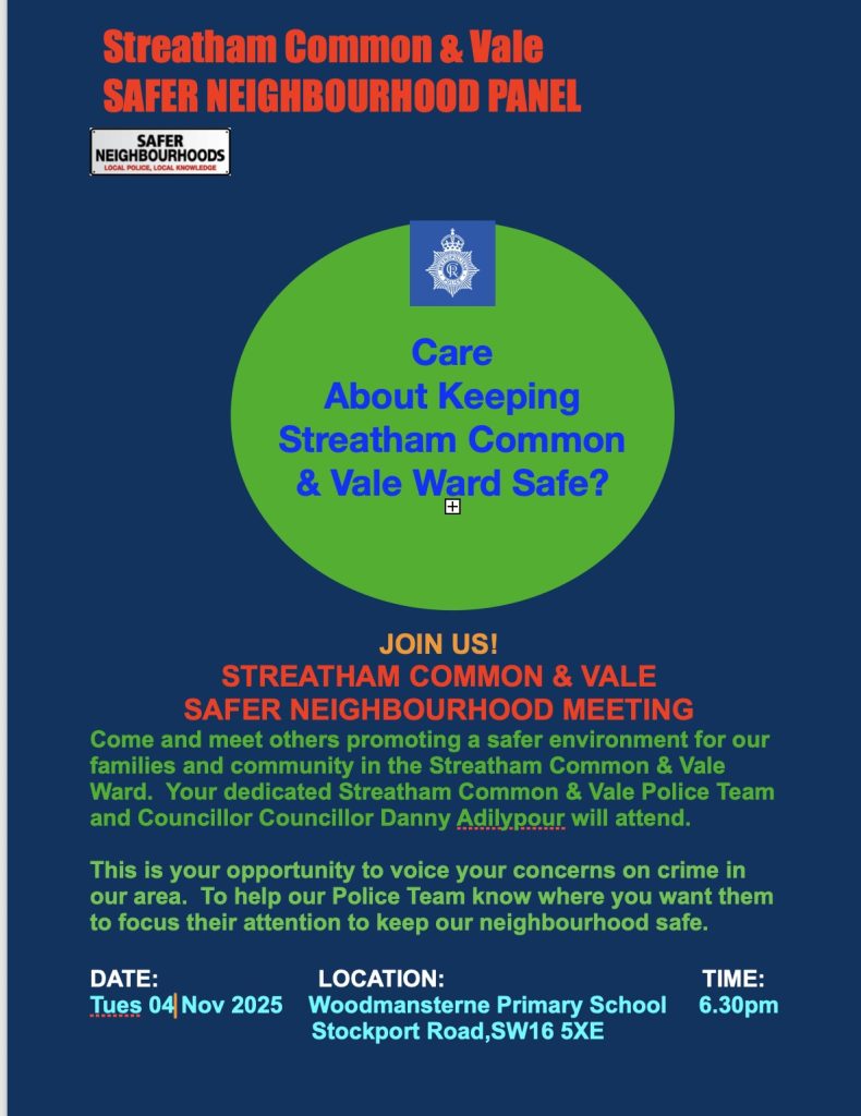 The next Streatham Common and Vale Ward Safer Neighbourhood Panel meeting will take place on Tuesday 4th November 2025 at 6.30pm at Woodmansterne Primary School, Stockport Road, SW16 5XE. Please do come along.